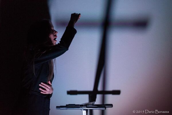 Una delicata donna timorosa, entra in scena, in uniforme, sembra quasi una bambina addestrata da un ipotetico regime totalitario, si pone davanti al leggio e inizia, come in un rituale, la sua lettura. La voce profonda, che pare impossibile uscire da quell’esile corpo, diviene suono, acuto e cupo, demoniaco a tratti. I movimenti, piccole contrazioni fisiche, scandiscono visivamente le parole, i loro accenti, la loro importanza.